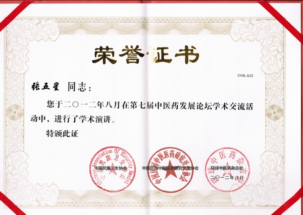 荣誉展示:中医中药副研究员张五星获得了中医药文化传播功勋奖